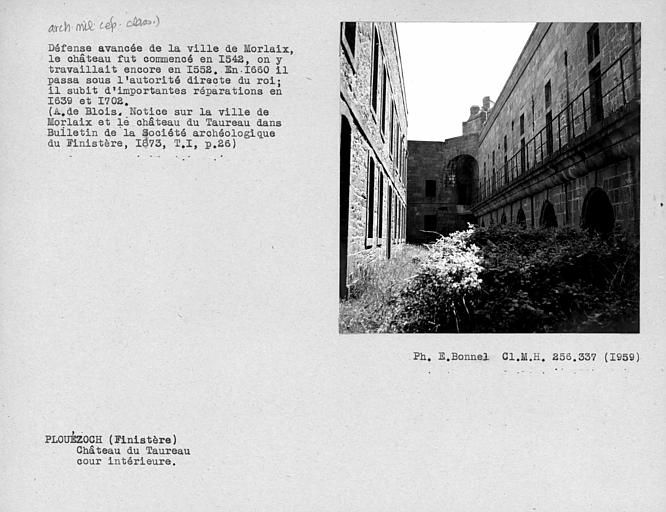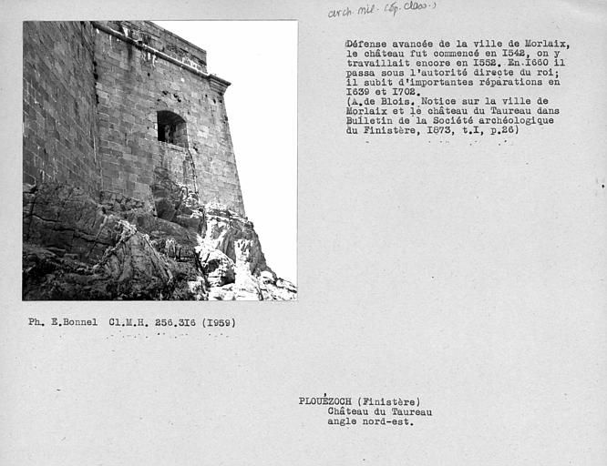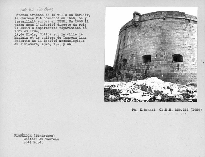 Vue de la tour Vauban, façade Nord-ouest (on aperçoit la cheminée du four à boulets), 1959