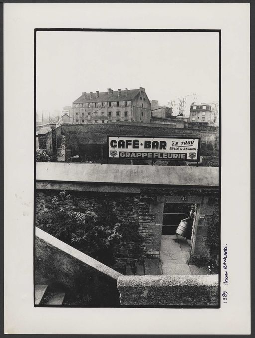 La prison de Pontaniou par Bruno Ravalard, 1989 : le bâtiment carcéral. Au premier plan, l'enseigne du café-bar Le trou et l'escalier menant à la rue Saint-Malo en contrebas. A l'arrière-plan : les immeubles du quartier de Recouvrance