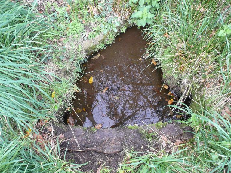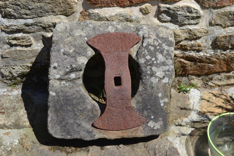 Moulin à eau de Leilzac'h, vestiges. Pignon sud, détail de l'évacuation de l'eau.